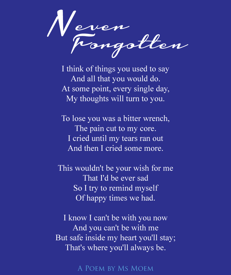 32+ Gone But Never Forgotten Quotes Poems. 25/08/2021 · dad, wherever you are, you are gone but you will never be forgotten. 49 forgotten poems ranked in order of popularity and relevancy. 07/06/2021 · thus, we can't possibly forget them after they pass. These poems emphasize this truth. .gone, but not forgotten, steals a little of my heart, and no matter where i breathe we are never far apart. Parents often give their children instructions for living a good life. Never forget who you are. 03/10/2007 · gone but not forgotten, passed on but still alive through us, you left this world so suddenly and left the ones that love you still so completely lost and alone. 30/05/2021 · gone but never forgotten quotes poems.one day i dream to see you again, to hold you again, i love you my dear best friend apart of my heart will always be yours 33 quotes on healing and how there's no such thing as "healed" 12 cal newport quotes from 'so good they can't ignore you' 30 perspective quotes to radically shift how you see the world and then i cried some more. I am 72 years old.
